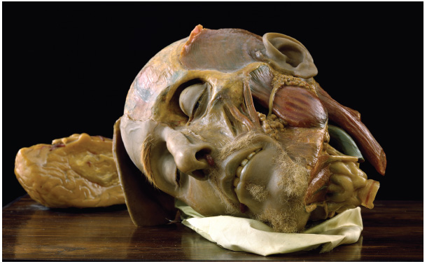 19. Восковая модель головы старика, созданная скульптором XVII в. Джулио Зумбо. Зумбо создавал подробные анатомические модели, в данном случае он нарастил слой цветного воска на настоящий череп.