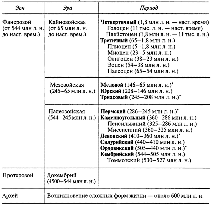Массовое вымирание происходило в каждом из пяти периодов геологической истории: ордовикском, девонском, пермском, триасовом и меловом (см. схему). В остальные шесть периодов геохронологической шкалы массовых вымираний не выявлено, хотя нет сомнений в том, что какие-то виды исчезали на протяжении всего интервала в 600 млн. лет, называемого фанерозоем, когда на Земле существуют сложные формы жизни. В течение ордовикского периода, продолжавшегося начиная с 505 до 440 млн. лет назад, жизнь на нашей планете существовала только в морях. Растения появились на суше и быстро распространились только в девонский период — приблизительно с 410 до 360 млн. лет назад. Начиная с пермского периода, примерно 286 млн. лет назад, настало время позвоночных — как мелких, так и крупных. И пресмыкающиеся, и млекопитающие существуют начиная с пермского времени, но гораздо более разнообразными млекопитающие стали после того, как примерно 65 млн. лет назад вымерли все динозавры.