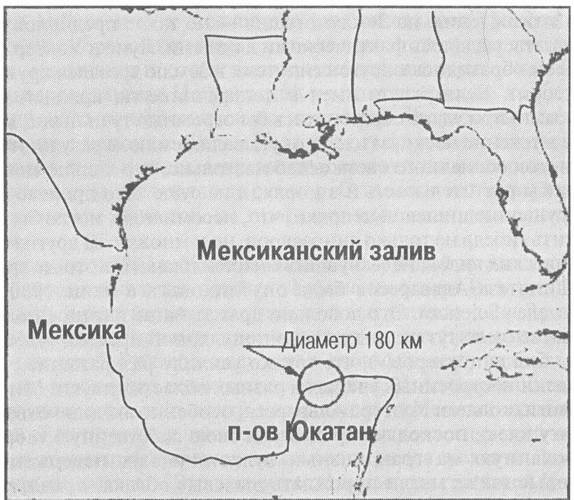В течение двух последующих лет в самых разных местностях было установлено присутствие иридия в пластах нужного возраста, но у других ученых возникли новые вопросы. Усилились сомнения в том, что иридий мог оставаться в атмосфере долгое время, достаточное, чтобы от единственного места удара метеорита разнестись по всему земному шару. Однако компьютерные модели показали, что «баллистическое рассеяние» иридия вполне возможно. В ходе этих дебатов оставалась одна более серьезная проблема: где найти требуемый кратер? Ни один из известных на суше кратеров не имел подходящего возраста или размера. Только в 1989 г. на северном берегу полуострова Юкатан океанографы, проводившие здесь съемку местности, обнаружили подводный кратер. После проведенных в 1993 г. измерений было объявлено, что диаметр этого кратера Chicxulub paвен 180 км, т. е. он больше штата Западная Виргиния и практически является самым большим из известных кратеров в Солнечной системе. Более того, исследования показали, что он образовался 65 млн. лет назад, а значит, в точности тогда, когда произошло массовое вымирание, уничтожившее динозавров. В течение еще четырех лет изучался материал, поднятый из кратера, и в 1997 г. уже другие ученые пришли к выводу, что отложения иридия и других элементов совместимы с геологическими находками в Губбио, Дании и Новой Зеландии, о которых в 1980 г. объявили Луис и Уолтер Альваресы и их коллеги — химики Фрэнк Азаро и Элен Мишель. С этого момента большинство ученых признало, что падение метеорита сыграло, по крайней мере, какую-то роль в исчезновении динозавров. С этим выводом согласовались и обнародованные в ноябре 1996 г. результаты исследований, показавшие, что Юкатанский метеорит врезался в Землю под острым утлом, вследствие чего над Северной Америкой могла пронестись колоссальная огненная буря.