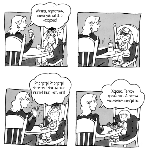 Например, если ваша двухлетняя дочурка угрожает вывалить макароны себе на голову, что, по вашему мнению, остановит ее быстрее: если вы с широкой улыбкой скажете «Нет» или если вы нахмуритесь, хлопнете в ладоши и грозно прорычите «Не-е-ет!»?