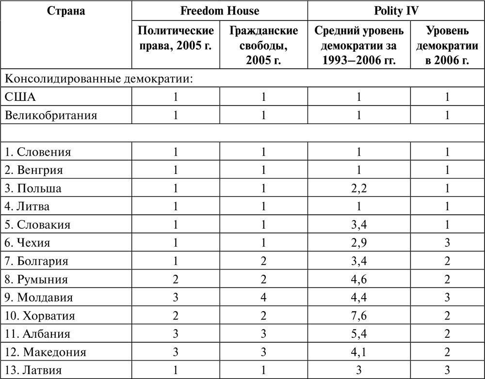 Таблица 20.1. Консолидированные демократии в посткоммунистической Европе в 1993–2006 гг. (сопоставление с США и Великобританией)