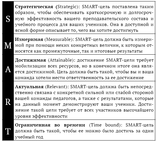 Чтобы завершить аналитический процесс, сфокусированный на системе в целом, рабочая группа задействует выявленные глубинные причины как для позитивных, так и для негативных результатов для разработки SMART-цели и плана действий по решению главной проблемы. Считается, что концепция в форме этой мнемонической аббревиатуры впервые была описана Дж. Т. Дораном в 1981 г. [Doran, 1981]. Концепция была использована в контексте управления проектами как инструмент оценки целей каждого проекта. Большинство педагогов обладает опытом в постановке SMART-целей, но им, скорее всего, все равно потребуется помощь и поддержка для формирования измеримой цели, которая была бы достижимой и при этом стоила усилий по ее достижению. На рис. 7.4 представлены некоторые дополнительные детали построения SMART-цели. SMART-цель – это цель, удовлетворяющая определенным требованиям, описанным в расшифровке акронима SMART.