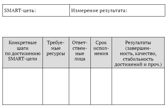 Для достижения SMART-цели необходим план действий. Чтобы составить его, члены рабочей группы по импрувменту должны продумать каждый шаг, ведущий к достижению цели. Если шаги не будут детально расписаны, достижение цели окажется под угрозой. Большинство качественных планов включают описание самой цели, а также показатели оценки конечного результата, которые помогут определить, насколько успешно команда достигла своей цели. Чтобы процесс достижения цели был управляем, в план действий обычно входят такие составляющие, как описание конкретных шагов, доступные ресурсы, распределение ответственности, временные рамки, а также показатели успешности для каждого из шагов плана. Стандартная форма плана действий приведена на рис. 7.5.