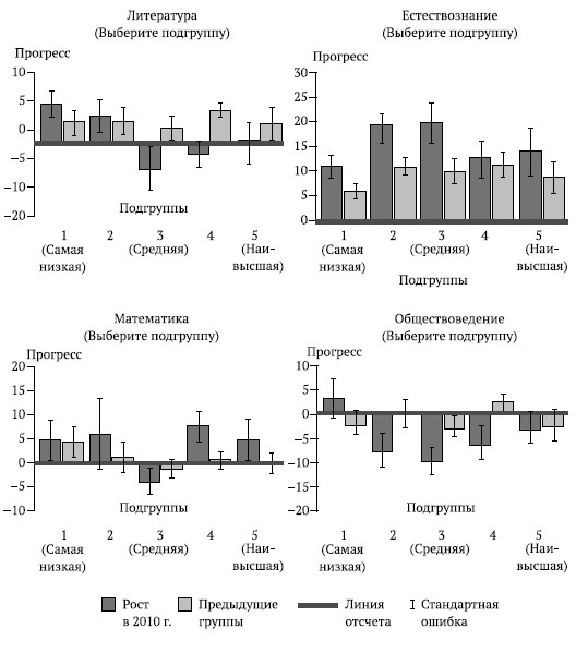 При изучении этих отчетов группа педагогов выявила интересную закономерность. Очевидно, что естествознание было для них успешным. Сводные результаты добавленной стоимости в этой предметной области были очень хорошими, и в дезагрегированных данных успех также явно прослеживался. Однако в других предметных областях педагогам не удавалось добиться прогресса среди учеников со средней успеваемостью (подгруппа 3), что видно в каждом из трех дезагрегированных отчетов на рис. 7.6. В отчете по естествознанию все пять подгрупп учеников демонстрируют прогресс, превышающий ожидания, а прогресс учеников со средней успеваемостью превышает прогресс остальных подгрупп. В трех других предметных областях прогресс средней подгруппы оказывается ниже прогресса остальных подгрупп. Таким образом, для данной группы учителей сильной стороной оказалось преподавание естествознания в целом и преподавание его ученикам со средней успеваемостью в частности. Проблемным для нее стал слабый рост средних учеников в трех других предметных областях.