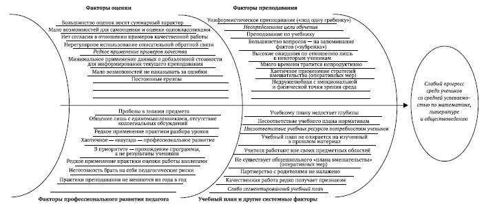 По множеству параметров обсуждение негативных результатов привело к прямо противоположным по сравнению с анализом позитивных результатов выводам. В качестве результата отчетов, на который направлен фокус анализа, участники команды записали: «Слабый прогресс среди учеников со средней успеваемостью по математике, литературе и обществоведению». Среди факторов, относящихся к научению, педагоги выделили «Неопределенные цели обучения», потому что по сравнению с целями в естествознании повседневные цели по другим трем предметам были гораздо более расплывчатыми и неопределенными. Из факторов, связанных с учебным планом, они выделили такой: «Несоответствие учебных ресурсов потребностям учеников». О том, что учебные планы по математике, литературе и обществоведению не отвечают нуждам учеников, наши учителя узнали, только когда сравнили их с учебным планом по естествознанию. Они также добавили в эту категорию факторов строку о том, что учебные планы плохо сегментированы, чтобы подчеркнуть разницу между материалами учебного плана по естествознанию и материалами учебных планов по другим трем предметам. Среди факторов оценки команда педагогов выделила «Нерегулярное использование описательной обратной связи». И снова качество и применимость обратной связи, предоставляемой ученикам, оказались в прямой зависимости от ясности и четкости постановки учебных целей. Результат проведенного анализа представлен на рис. 7.10.