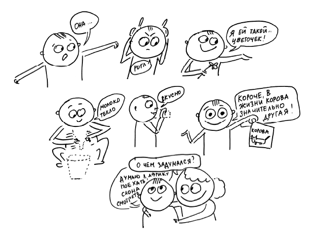 Резюмируя приведенные примеры, хочу сказать, что для развития ребенка нужны главным образом не красиво изданные энциклопедии, а живой, практический опыт, новые впечатления. Вот почему городских детей полезно вывозить в деревню, в лес, на речку. Корова с огромными рогами и массивным выменем в метре от тебя дарит совсем другие эмоции, нежели картинка в книжке. И конечно, никакая картинка не может передать восхитительный запах лесной малины (ну, не так, совсем не так она пахнет в универсаме!), или грибов, или речной рыбы. И то, что карасик скользкий на ощупь, картинка тоже не передаст.
