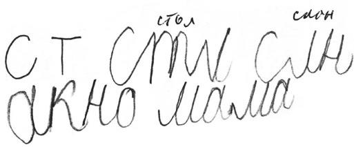 При выполнении пробы на реципрокную координацию, кроме недостаточной автоматизированности выполнения, отмечаемой и при предыдущем обследовании, у мальчика было выявлено отставание левой руки. О слабости правополушарных функций говорили и специфические ошибки на письме: пропуски и замены гласных (рис. 21).