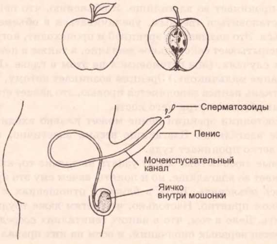 Разрезав яблоко на две половинки, вы увидите внутри семечки и сердцевину. На этом рисунке дано поперечное сечение яблока. А на нижнем рисунке представлено поперечное сечение, которое показывает, что внутри пениса и мошонки.