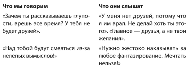 Чрезмерное фантазирование ребенка наряду с молчанием – другая крайняя форма проявления потребности в любви и нарушения доверительных отношений с родителями. Своими мечтаниями он заполняет пустоту. И это шанс для мамы сблизиться! Потому что любить кого-то означает разделять с ним фантазии и страхи. Если вас пугают фантазии ребенка, то, скорее всего, вы живете с чувством опасности, угрозы или с чувством вины за то, что не преуспели в воспитании. Эти глубокие, негативные, тревожные переживания родители выносят из собственного детства, когда с ними никто не церемонился. Родительство неизбежно возвращает нас в свое детство – с его тревогами, страхом наказания, чувством беспомощности перед взрослыми.
