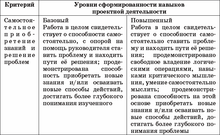 В этом случае предлагается выделять два уровня сформированности навыков проектной деятельности: базовый и повышенный. Основное отличие уровней – в степени самостоятельности школьника-проектировщика. Так что процедура состоит в выявлении и фиксации того, какие операции в ходе выполнения учебного проекта ученик выполняет самостоятельно, а какие – с помощью учителя, руководителя проекта. Примерное описание каждого из приведённых выше критериев даётся в воспроизводимой нами таблице.