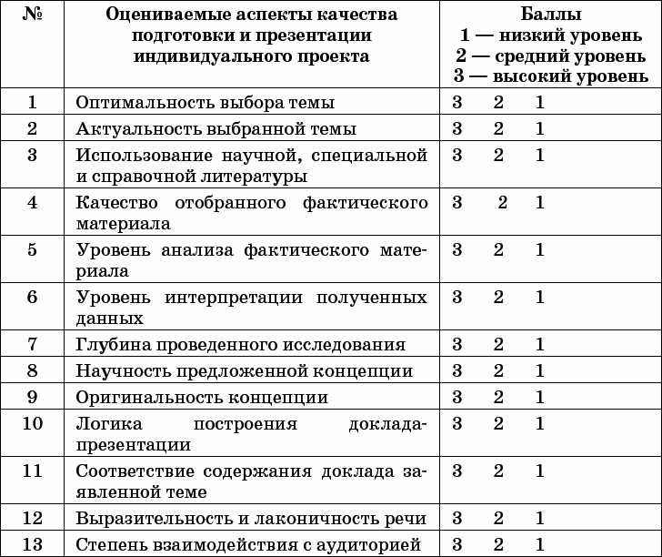 В каждом образовательном учреждении может быть разработана собственная методика оценивания результатов учебного проектирования школьников, которую необходимо закрепить в локальном акте школы. При этом следует ориентироваться на критерии оценки индивидуального проекта школьника, предложенные в разделе 1.3.3. Примерной основной образовательной программы для основной школы[10]. Воспроизведём перечень этих критериев.