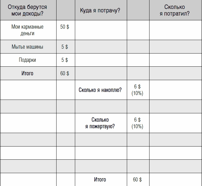 Теперь, когда вы объяснили вашему ребенку разницу между необходимыми потребностями и пожеланиями, а также значение альтернативных издержек, помогите ребенку снова заполнить еженедельную ведомость доходов и расходов. Сначала полностью заполните графу доходов, затем – графу расходов. Прежде чем заполнить последнюю графу, выделите разумную сумму для накоплений и благотворительности – по 10 процентов. Общие расходы должны равняться общим доходам.