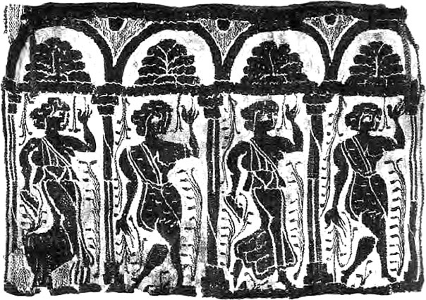 Танцоры. На этой ткани античного периода истории Египта вытканы изображения танцующих мужчин и женщин. Фото А. Де Море, Коптский текстиль из Фламандской частной коллекции, Зоттегем, 1993, Кат. 60