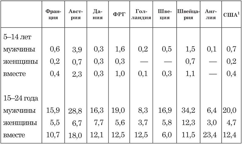 Статистика дает цифру 5170 самоубийств среди молодежи (в возрасте от пятнадцати до двадцати четырех лет) в США в 1982 году, и это в 5 раз превышает количество самоубийств, зарегистрированных в 1950 году (в 1985-м количество их увеличилось еще на 6000 человек, то есть каждый семнадцатый из этой возрастной категории). Американская ассоциация суицидологии еще более усугубила общую картину, поскольку ее члены считают, что одна удавшаяся попытка приходится на 50 неудавшихся. Данная возрастная группа в США – единственная, где смертность постоянно растет.