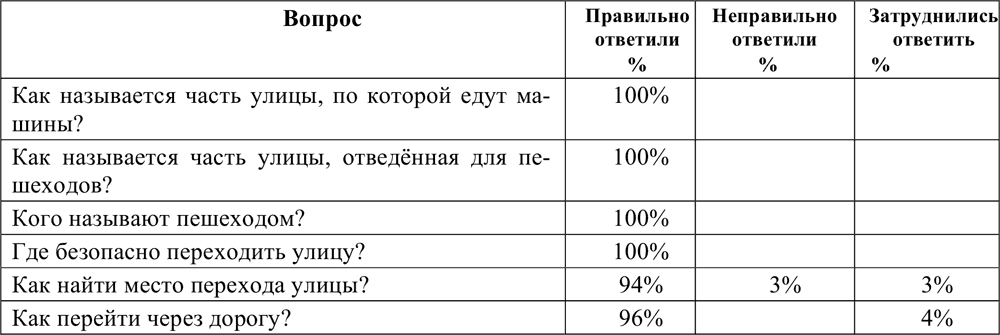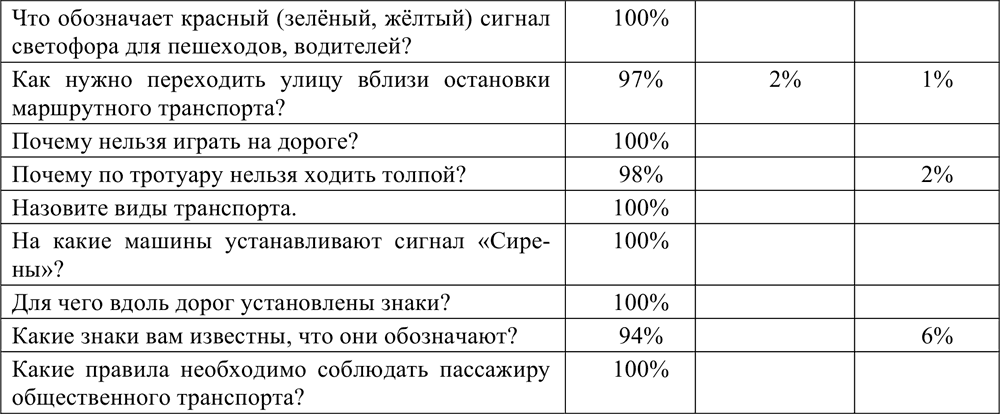 Анализ таблицы показывает, что у детей знания о культуре поведения носят осознанный характер, эмоционально-окрашенный, с опорой на личный опыт. Дети показали знания разных видов транспорта, активно высказывали свое отношение к выполнению правил поведения на дороге и в транспорте (Например: «А мы с мамой всегда переходим дорогу там, где есть светофор и смотрим по сторонам», «На дороге нельзя играть, потому что можешь заиграться и не увидеть машину, а еще игрушки могут попасть под колеса и будет авария», «В трамвае нельзя кричать и бегать, а еще там нужно держаться за поручни, а то упадешь», «Когда едешь в машине, нужно сидеть в специальном кресле и пристегиваться»).