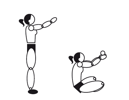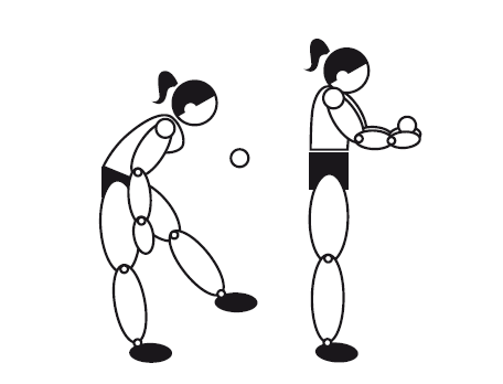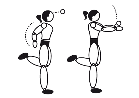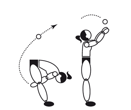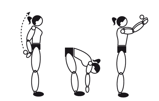 17. И.п. – стоя на правой ноге (левая нога согнута), бросить мяч правой рукой из-за спины так, чтобы он перелетел через левое плечо.