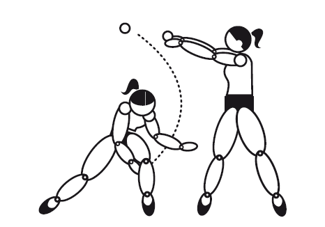 2. То же, но два партнера стоят спиной вполоборота к стене и друг к другу. Мяч посылают в стену так, чтобы он отскочил к партнеру.