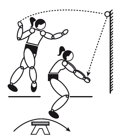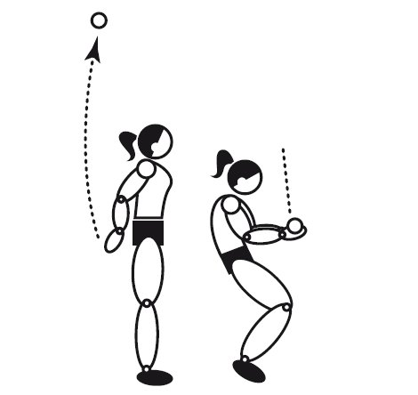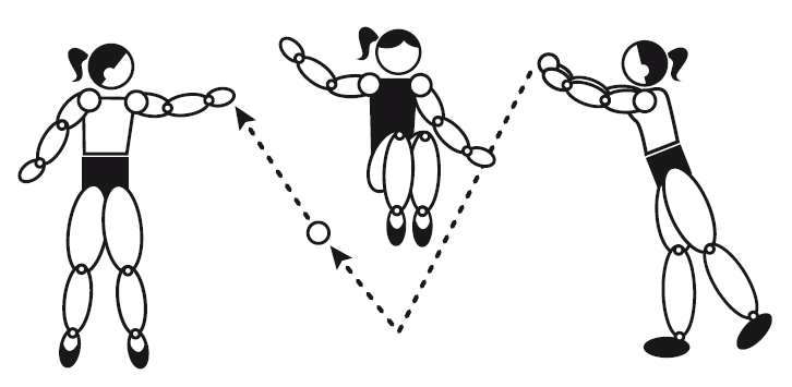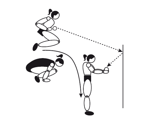 4. То же самое, но с двумя передающими партнерами: два партнера, располагаясь друг за другом, поочередно посылают мячи в пол, через которые перепрыгивает и ловит после отскока от стены первый игрок. Обратная передача выполняется в момент прыжка через второй мяч. Прыжки следует выполнять с высоким подниманием бедер, а передачи производить в высоком темпе с большой силой. Поворот для ловли мяча можно выполнять в воздухе во время прыжка, а также после приземления.