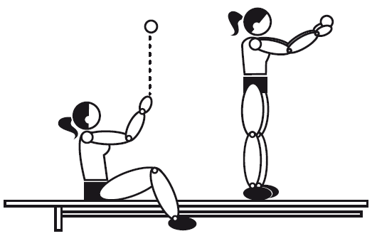 1. И.п. – сед верхом на гимнастической скамейке, мяч в руках. Бросить мяч вверх и, встав на скамью, поймать его (рисунок 191).