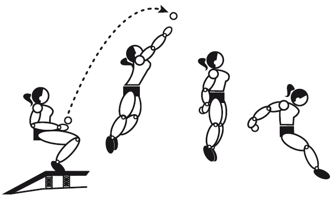 1. Прыжки вверх-вперед после разбега и толчка с подкидного мостика (трамплина) и выполнение приемов с мячом в момент полета: