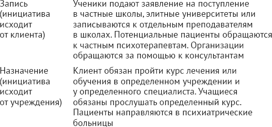 На другом полюсе распределение – назначение. Людей обязывают иметь дело с конкретным учреждением или специалистом; если они хотят совершенствоваться, им придется согласиться с назначением. Ожидается, что клиенты будут подчиняться этому требованию либо потому, что того требует закон, либо потому, что совершенствование отвечает их собственным интересам или интересам семьи, фирмы или общества. Если клиенты сопротивляются, их могут наказать. В школьном обучении немало примеров подобных назначений с оттенком предписания. Ученики распределяются по государственным школам по возрасту и месту жительства, в школе прикрепляются к определенным учителям. Учащиеся частных школ и университетов часто должны выбирать обязательные курсы и конкретных преподавателей. Сотрудникам среднего и низшего звена в фирмах часто приходится сотрудничать с консультантами, которых наняло высшее руководство для совершенствования организации. Некоторые люди попадают к психотерапевту по решению судов, гражданского судопроизводства, работодателей или членов семьи.