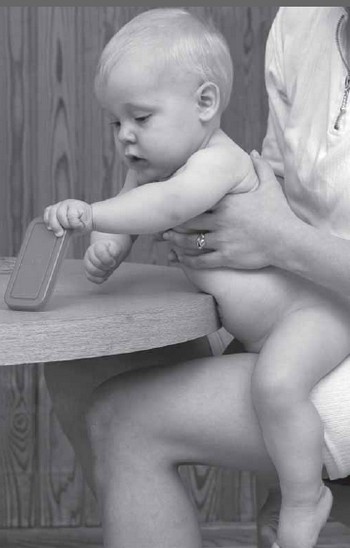 Примерно с пяти месяцев ребенок приобретает новый опыт, играя с предметами, когда сидит за столом у вас на коленях. Предметы лежат перед ним на столе. Крепко обхватите его двумя руками, или пусть он откинется назад, опираясь спинкой о ваше тело, а вы прижмите его к себе одной рукой.