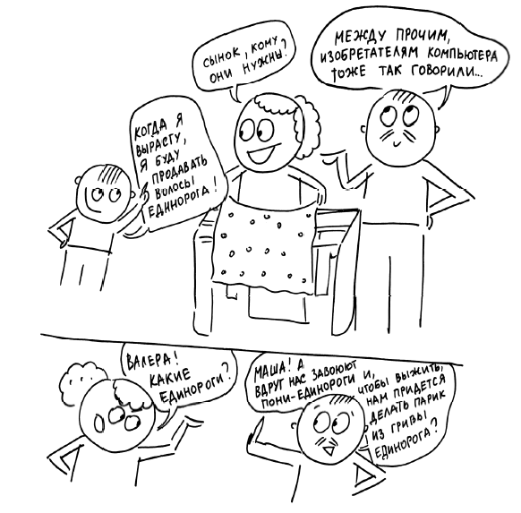 Если ребенок скажет, что хочет говорящую собаку, я не буду говорить «невозможно». Я скажу, что такой породы ПОКА нет. «Но может быть, ты что-нибудь потом придумаешь?»