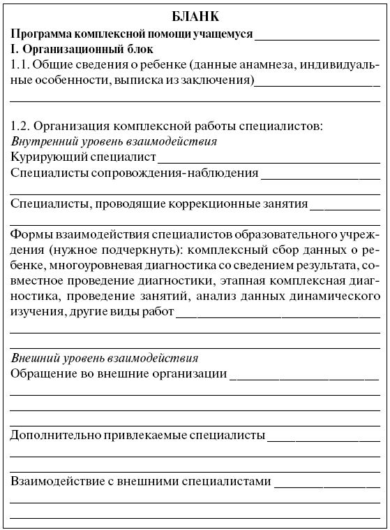 В обобщенном виде программа комплексной помощи представлена на бланке, который заполняется специалистами разного профиля и служит единым информационным полем для участников процесса сопровождения.
