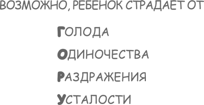 Действовать проактивно вам поможет привычка «подниматься на ГОРУ», прежде чем откликаться на сигналы, подаваемые детьми. Заметив в поведении ребенка настораживающие изменения, окиньте ситуацию взглядом с вершины: возможно, ребенок испытывает Голод, чувство Одиночества, Раздражение или Усталость? Тогда все, что от вас требуется, чтобы благополучно разрешить ситуацию, – это подкинуть ему что-нибудь вкусненькое, поиграть с ним, расспросить о его переживаниях или дать возможность выспаться. Иными словами, иногда родителю достаточно быть предусмотрительным и уметь планировать.