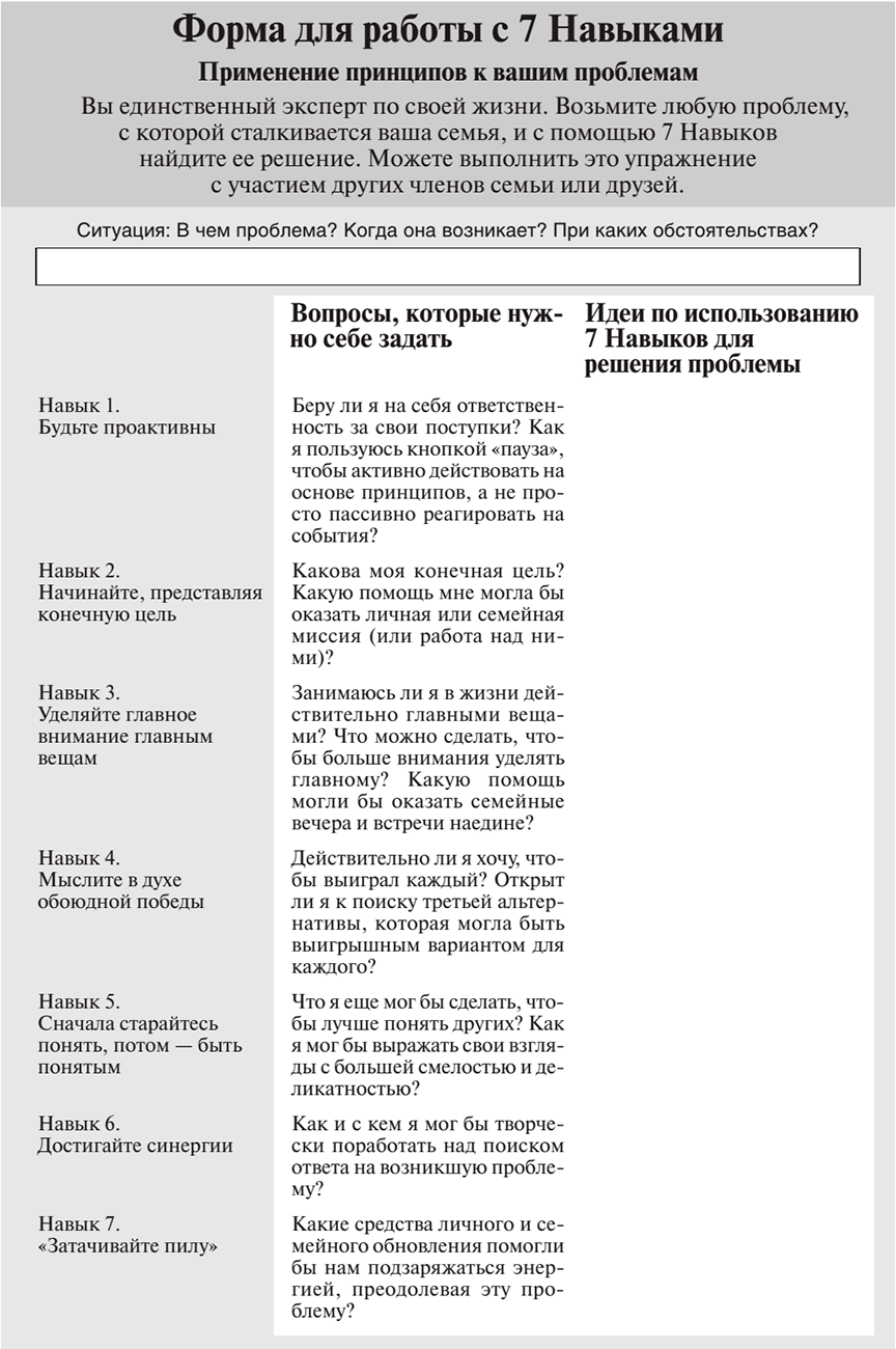 Сейчас я хочу попросить вас выделить какую-нибудь проблему, существующую в вашей семье, и посмотреть, как система 7 Навыков может быть приложима к этой ситуации. Для облегчения задачи прилагаю специальную форму. Если такая или схожая процедура решения семейных проблем войдет у вас в привычку, обещаю, что в дальнейшем вы будете справляться со своими проблемами с каждым разом все более эффективно, потому что вам будут помогать принципы, которые управляют всей жизнью.