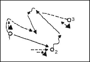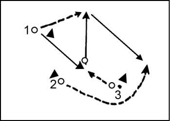 • отдавший пас игрок должен открыться для игры «в стенку» с получившим мяч партнером (2 помогает 3, 3 помогает 1);