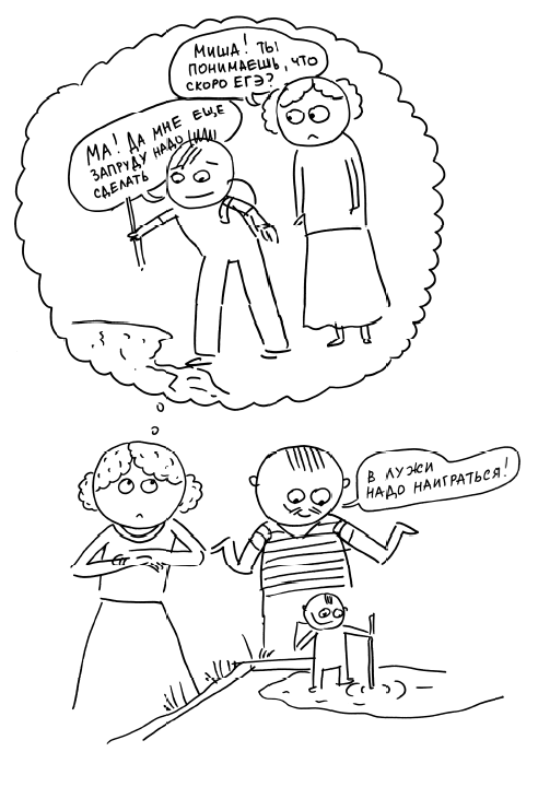 А могло бы быть и по-другому: «Ой, не надо! Не лезь в лужу!» (Есть у меня гипотеза, что, если не наиграться с лужами в два года, ребенок все равно наверстает недополученный опыт позже, лет, скажем, в десять. То есть в десять лет ему будет не до учебников, если важный опыт взаимодействия с лужами он упустит.)