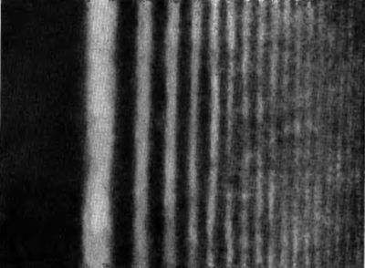 Поэтому около края тени мы получим темные полосы. Чем меньше длина волны, тем уже полосы. Обычно эти полосы не видны невооруженным глазом, но, как показано на фото II, их можно увидеть при помощи оптических инструментов.