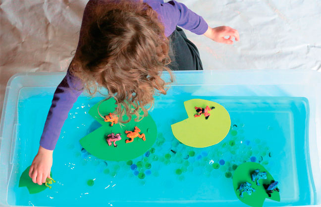 Помогите малышу придумать первый сюжет. Задайте наводящие вопросы, например: «А что это тут происходит?» или «А это кто?». Можно начать рассказывать историю самим, если ребенку пока трудно с этим справиться. Новичкам я советую попрактиковаться на Мире лягушат. Его очень легко построить, и он неизменно производит фурор. Поиграйте за лягушонка, «проведите» его по этому миру. Начните рассказывать его историю и вовлеките ребенка в игру вопросами вроде «А что дальше случилось?» или дайте ему возможность выбрать: «Как ты думаешь, лягушонок сейчас нырнет на дно пруда или перепрыгнет на другую кувшинку?» Со временем, немного потренировавшись, малыш возьмет инициативу рассказчика в свои ручки.
