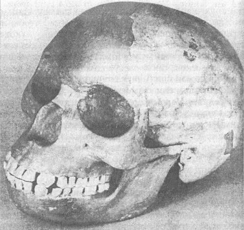 Фотоснимок черепа пилтдаунского человека, который был найден в 1912 г. в Англии Чарльзом Доусоном и, по заверениям множества экспертов, служил подлинным свидетельством «недостающего звена» в эволюции человека. В 1953 г. разоблачен как подделка. (Из коллекции Лондонского музея, Англия.)