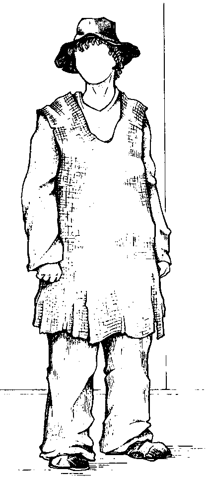 Костюм Лешего. На нем широкие штаны, валенки (или старые разношенные тапки), длинная рубаха, на которую сверху надет мешок с разрезами для рук и головы. Из-под шапки торчат лохматые волосы (парик или пакля).