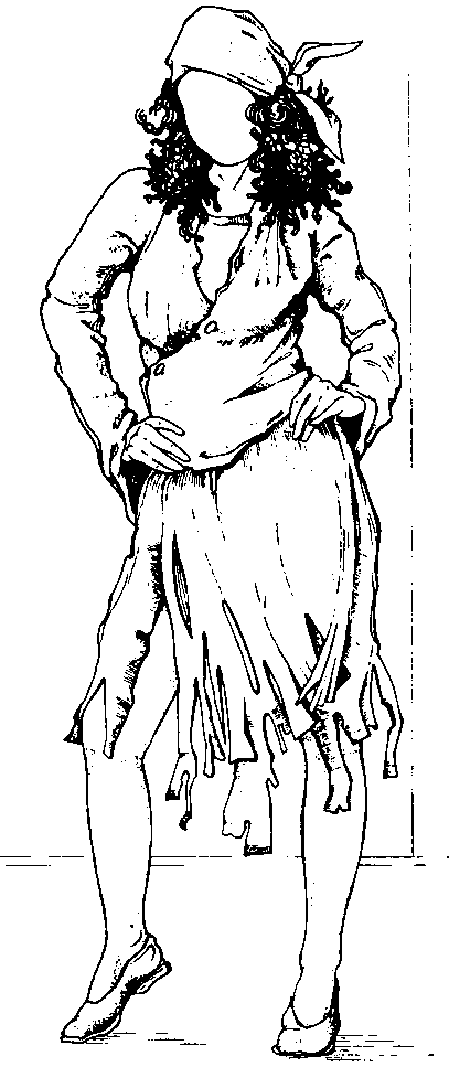 Баба Яга одета в залатанную кофту, длинную юбку. Но, надеясь принять участие в празднике, она постаралась принарядиться: надела бусы из шишек, платок заменила шляпкой, украшенной еловыми веточками...