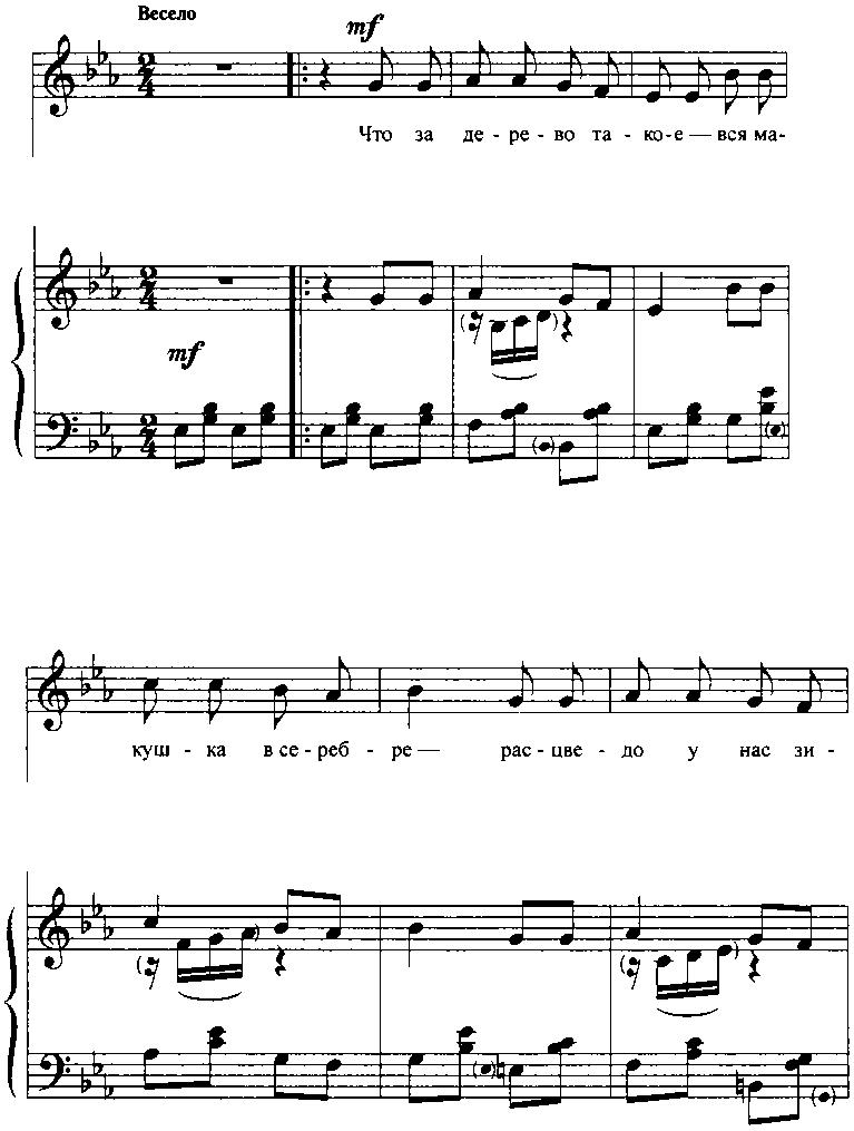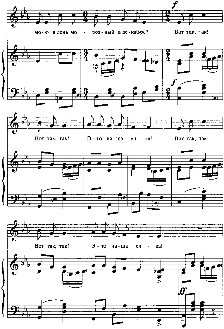 Дед Мороз. Ну что, Яга, давай дальше соревноваться. Уговор есть уговор. Теперь — кто кого перепоет. Ну-ка, ребятки, давайте про елочку, нашу красавицу, споем! Уж больно нарядна и красива она у нас, глаз не оторвать...