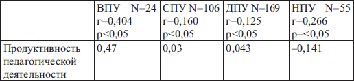 Результаты корреляционного соотношения групп учителей, обладающих разной продуктивностью деятельности с их возрастными показателями (при вычислении коэффициента корреляции использовалась формула Бравэ-Пирсона), выявили низкую зависимость продуктивности деятельности педагогов групп от их возрастных данных (табл. 3).