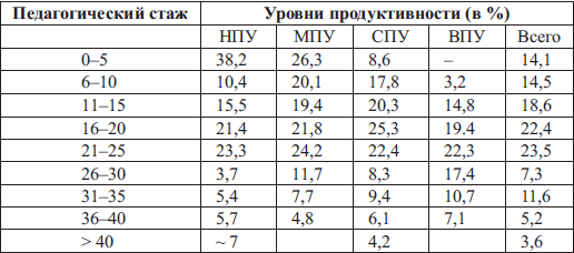 Ранжирование педагогов в соответствии с опытом педагогической деятельности позволило выявить зависимость продуктивности педагогической деятельности от показателей педагогического стажа (табл. 4).