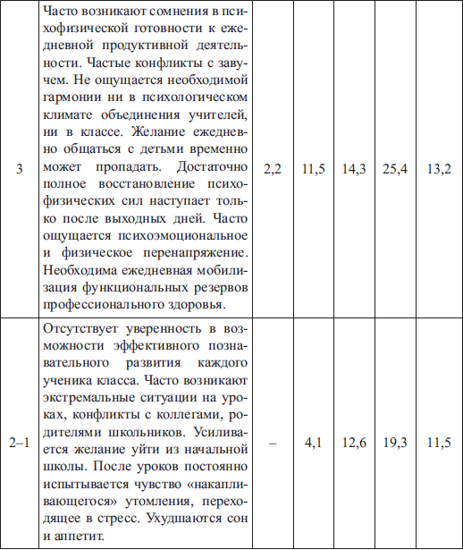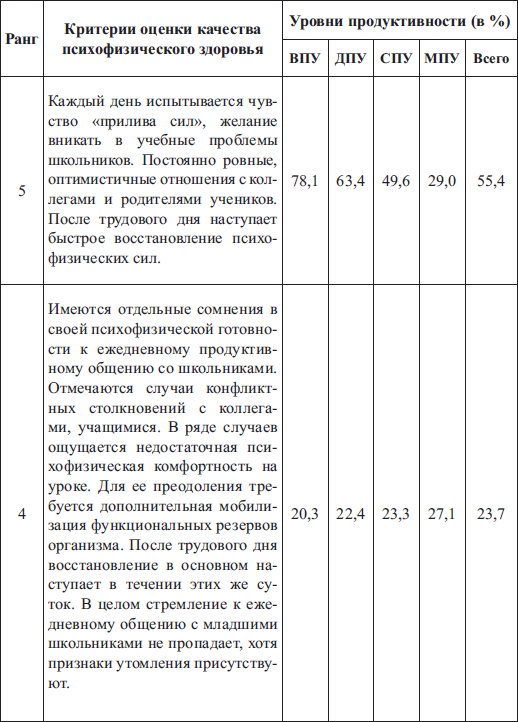 В табл. 5 представлены результаты качественного соотношения самооценки педагогами разных уровней продуктивности своего профессионального здоровья. Пятый ранг данной таблицы означает полное соответствие психофизического состояния учителя требованиям высокопродуктивной педагогической деятельности в начальной школе. Четвертый ранг предполагает, что акме-энерго-информационный потенциал учителя нуждается в определенной мобилизации психофизического функционального резерва. Третий ранг свидетельствует, что развитие профессионализма блокируется негативными проявлениями психофизического состояния. Второй-первый ранг выявляют профессиональное несоответствие в связи с общей деградацией психофизического состояния учителя.