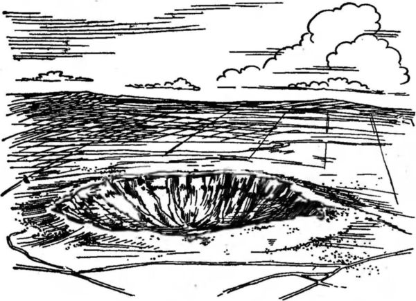 Рис. 11. Метеоритный кратер в пустыне Аризона. Вероятно, этот метеорит упал несколько десятков тысяч лет назад. Диаметр кратера — около 1200 м, глубина 195 м. Кратер образовался при падении огромного метеорита, состоящего из железа и никеля.