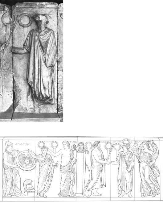 102. Реконструкция скульптуры на склепе Зоила, лучшее изображение самого Зоила (слева). В левой части рельефа он представлен в характерном римском стиле (одетым в тогу и выступающим как оратор). В правой части он больше похож на грека