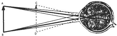 Рис. 62. Величина изображения в глазе в зависимости от расстояния предмета.