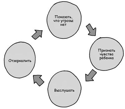 Порядок не всегда соблюдается один в один, но в большинстве случаев для того, чтобы наладить контакт с ребенком, когда он выбит из колеи или скверно себя ведет, следует проделать четыре действия. И первое из них – показать, что угрозы нет.