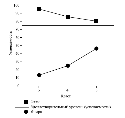 Но действительно ли отчеты по добавленной стоимости могут сообщить нам что-то, чего мы не узнаем из данных об успеваемости? Рассмотрим еще один пример сравнения успехов Элли и Яниры (рис. 1.5). Оценки Элли стабильно оказываются выше удовлетворительного уровня успеваемости. В 3-м классе ее оценка по математике соответствовала 96-му процентилю, в 4-м – 88-му, а в 5-м – 80-му. Несмотря на то что все оценки были выше минимальных требований, мы видим, что ее оценки ухудшались из года в год. Когда мы смотрели только на оценки Элли в 5-м классе, нам казалось, что она, ее преподаватель и ее школа вполне успешны. Что могла бы предпринять преподаватель Элли, если бы в ее распоряжении оказались данные о динамике оценок девочки?