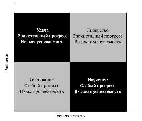 Эта простая матрица сопоставляет показатели успеваемости и прогресса, в понятной форме демонстрируя реальные успехи школ и учебных программ. одновременный анализ данных о добавленной стоимости и успеваемости дает возможность быстро определить, в какую ячейку матрицы попадает та или иная школа. Каждая ячейка соответствует совершенно особой школьной среде. К какой ячейке принадлежит ваша школа – ее ученики лидируют, учатся, успешны или отстают? Почему это происходит? В следующих главах мы подробно рассмотрим аналогичную матрицу, чтобы дать вам инструмент для выявления сильных и слабых сторон ваших школ и образовательных систем, а также вызовов и возможностей, с которыми они имеют дело.