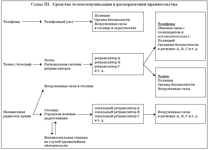 Технический прогресс работает на нас, так как связь между нашими различными группами может осуществляться с помощью дешевых и надежных переносных радиостанций двусторонней связи, которые сейчас можно достать везде. Мы должны, однако, лишить оппозицию возможности пользоваться своими проводными системами связи. Сделав это, мы парализуем реакцию оппозиции и помешаем ей мобилизовать против нас силы, все еще находящиеся под ее контролем. Как показывает Схема III, нейтрализация средств телекоммуникации будет осложнена их многочисленностью и взаимозаменяемостью, и здесь надо обязательно добиться полного охвата. Переворот левых эсеров против большевиков в июле 1918 года провалился частично потому, что его организаторы не осознали необходимости монополизации всех средств телекоммуникации. Левые эсеры проникли в ЧК, главный инструмент большевистской власти, и различные армейские подразделения; с их помощью они арестовали главу ЧК Дзержинского, захватили несколько общественных зданий и московский телеграф. Однако они не смогли захватить телефонную станцию, и в то время как они рассылали с телеграфа по всей России сообщения с просьбой оказать им политическую поддержку, Ленин использовал телефонную связь, чтобы мобилизовать свои боевые силы, с помощью которых переворот был быстро подавлен.