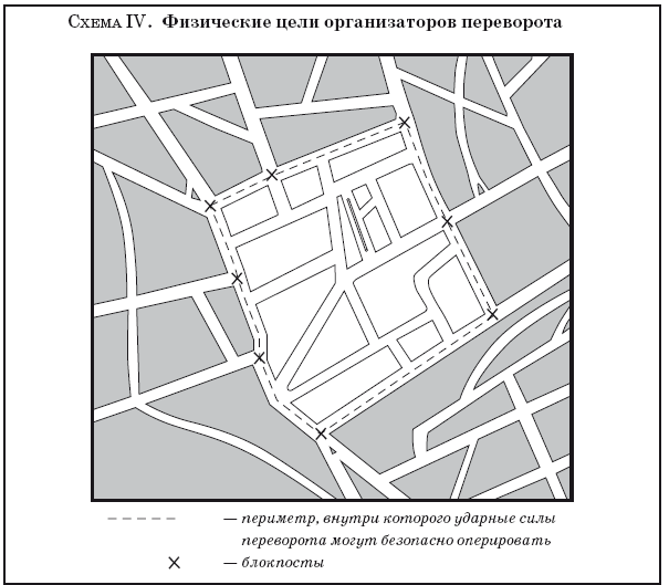 Во время активной фазы переворота неожиданное прибытие даже небольшого контингента поддерживающих правительство или не привлеченных на нашу сторону сил может поставить под серьезную угрозу все начинание. Если правительство выяснит, что часть его собственных вооруженных сил зайдействована в перевороте в столице, его логичной реакцией будет призыв к войскам, размещенным в других местах, в надежде на то, что заговорщики смогли привлечь к перевороту только части столичного гарнизона. Так как весьма трудно проникнуть во все части на территории страны, надежда правительства может оказаться обоснованной. Мы атакуем механизм, который может привести к прибытию верных правительству сил в столицу на каждом его уровне: мы арестуем тех, кто мог бы призвать их на помощь, мы нарушим линии связи, необходимые, чтобы установить с ними контакт, и попытаемся изолировать верные правительству силы с помощью прямых (хотя и чисто оборонительных) военных мер. Мы также должны предотвратить вмешательство этих сил с помощью контроля над последним уровнем: периметром столицы, где совершается переворот.