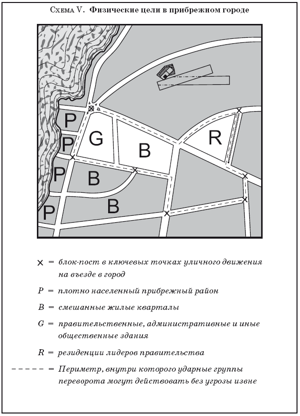 Создав эффективные оборонительные блокпосты в подходящих местах, мы сможем воспрепятствовать проникновению верных правительству сил в столицу на то короткое время, которое нужно нам для того, чтобы взять в свои руки правительственную власть и получить заверения в лояльности от основной части вооруженных сил и бюрократического аппарата. Таким образом, к тому моменту, когда силы вмешательства достигнут места совершения переворота, уже они превратятся в изолированную группу повстанцев. Наиболее подходящие для возведения блокпостов места, которые можно удерживать небольшими силами и ограниченным вооружением, а также технология, необходимая для такого рода действий, рассматриваются в Приложении Бив пятой главе, где мы описываем прямую нейтрализацию верных правительству сил. Схема IV иллюстрирует места, которые будут выбраны в конкретном вымышленном примере. Но наш контроль над физическим доступом в столицу послужит и другим целям. Это будет одним из путей публичной демонстрации физического присутствия нового режима, а также предотвратит бегство лидеров правительства и других лиц, которых мы не сможем арестовать. Одна из опасностей, с которыми мы, вероятно, столкнемся, – то, что оппозиция активизируется, если какой-либо из важных фигур правительства удастся бежать из столицы и присоединиться к верным правительству силам за ее пределами. В этом случае все усилия, которые мы предприняли с целью нейтрализации таких сил внутренними мерами и путем создания помех для их транспортных и коммуникационных возможностей, могут пойти насмарку. Если верным правительству силам и не удастся достичь столицы, у политических лидеров появится шанс добраться до этих сил. Не факт, что средств, имеющихся в нашем распоряжении, хватит для того, чтобы надежно прикрыть всю столицу, хотя многое, конечно, будет зависеть от ее местонахождения и площади.